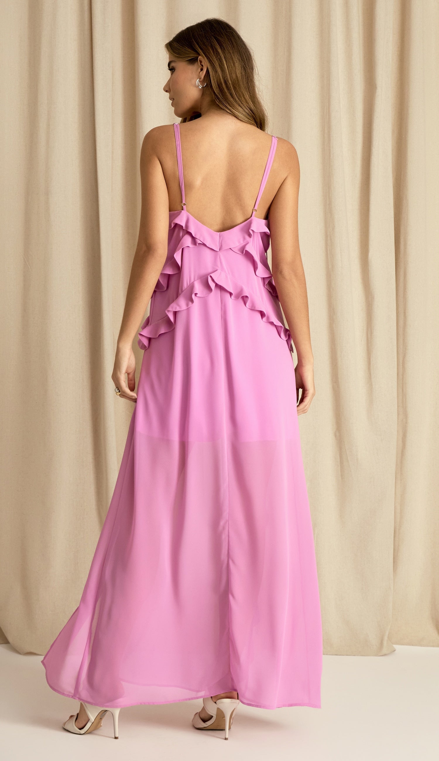 Vestido longo confeccionado em crepe leve com forro. Possui decote em V; alcinhas reguláveis; tirinhas para amarrar nas cavas e no decote, ajustando as aberturas; fenda frontal; recortes e aplicação de babados frontais e traseiros no busto, na cintura e também ao longo do comprimento na parte da frente.