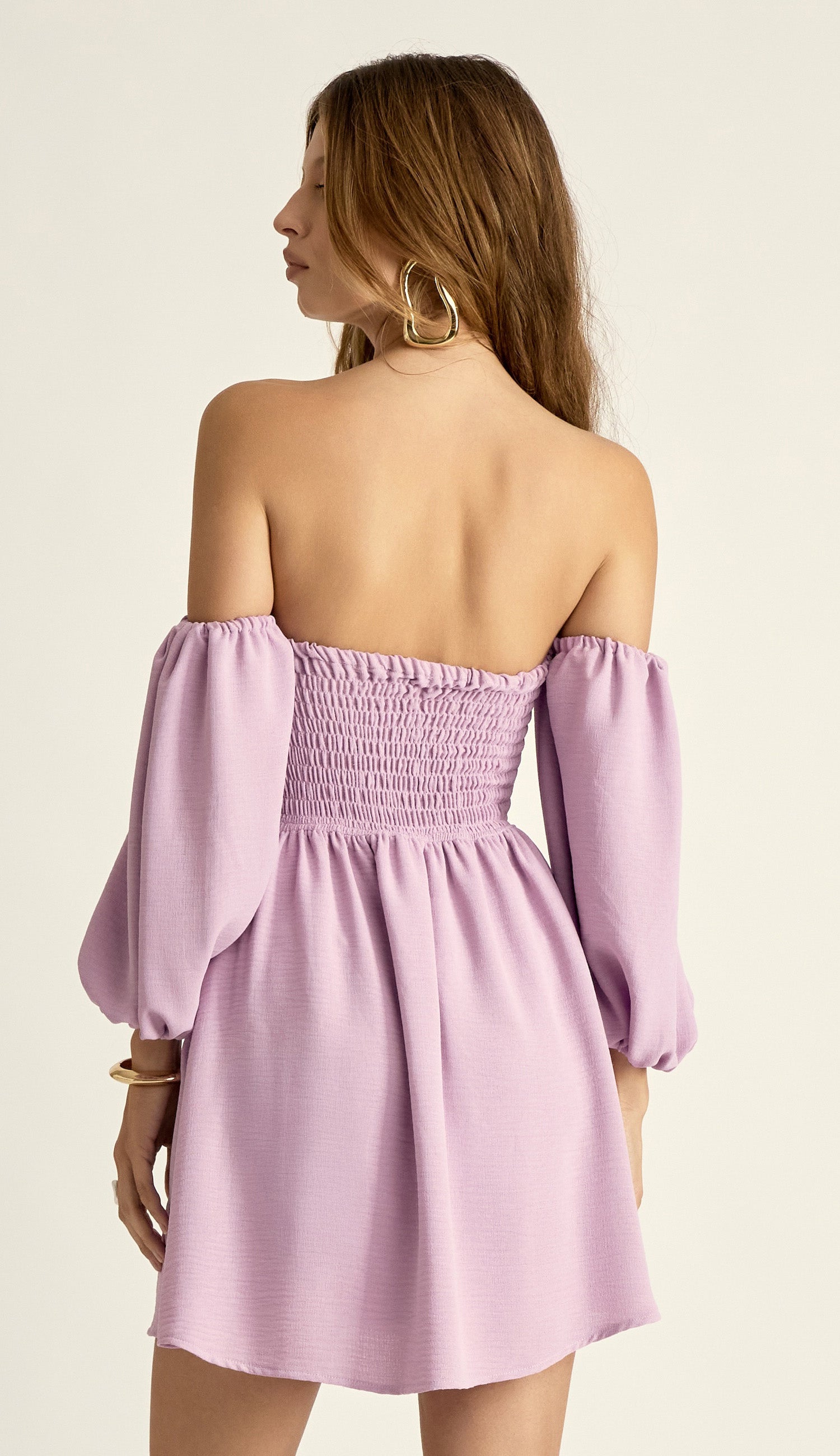 Vestido curto confeccionado em crepe leve texturizado com aspecto de linho e efeito amassadinho. Possui decote coração com silicone elástico interno, detalhe vazado no centro, recortes que modelam o busto, pala na cintura, mangas bufantes com elástico nos ombros e nos punhos, estilo ciganinha; saia soltinha e lastex franzido nas costas para melhor ajuste ao corpo.