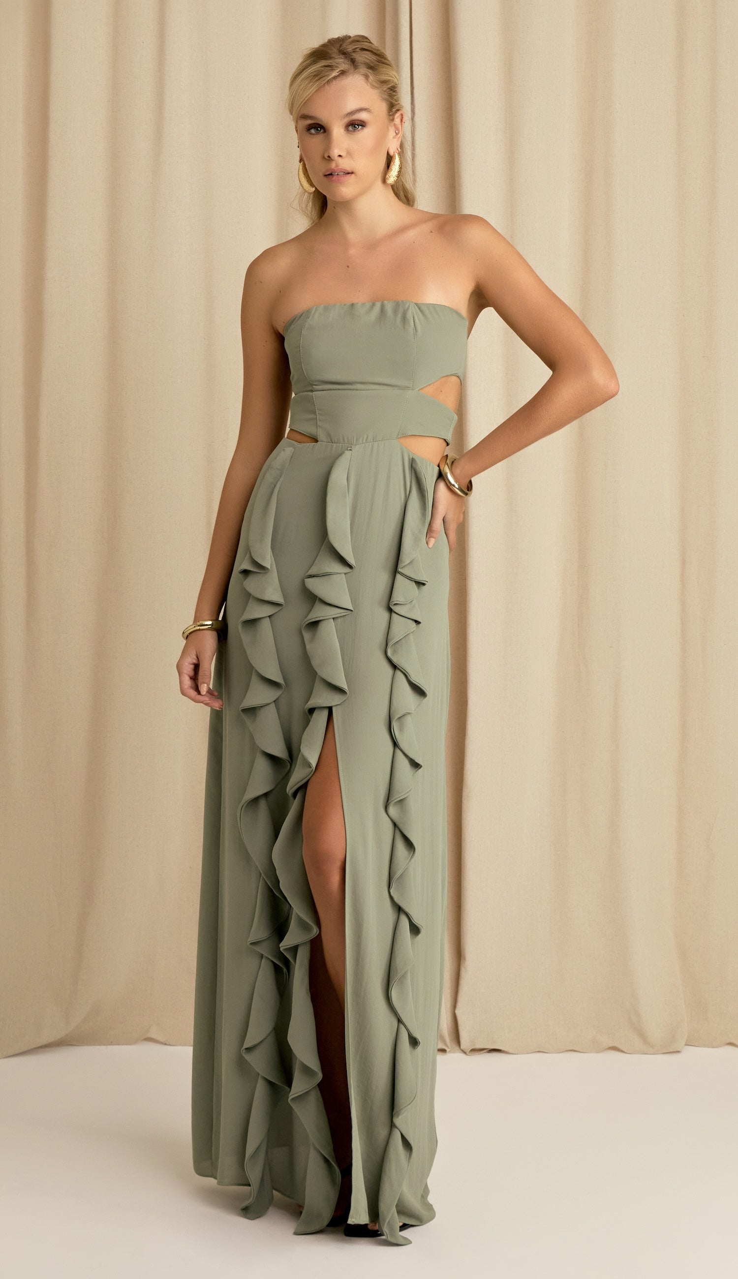 Vestido longo sem mangas confeccionado em crepe leve com forro. Possui decote reto com silicone elástico interno para maior segurança, recortes no busto e na cintura que modelam a peça, recortes vazados nas laterais, fileiras verticais de babados em cascata, fenda frontal, elástico nas costas para melhor ajuste ao corpo e fechamento traseiro por zíper invisível.