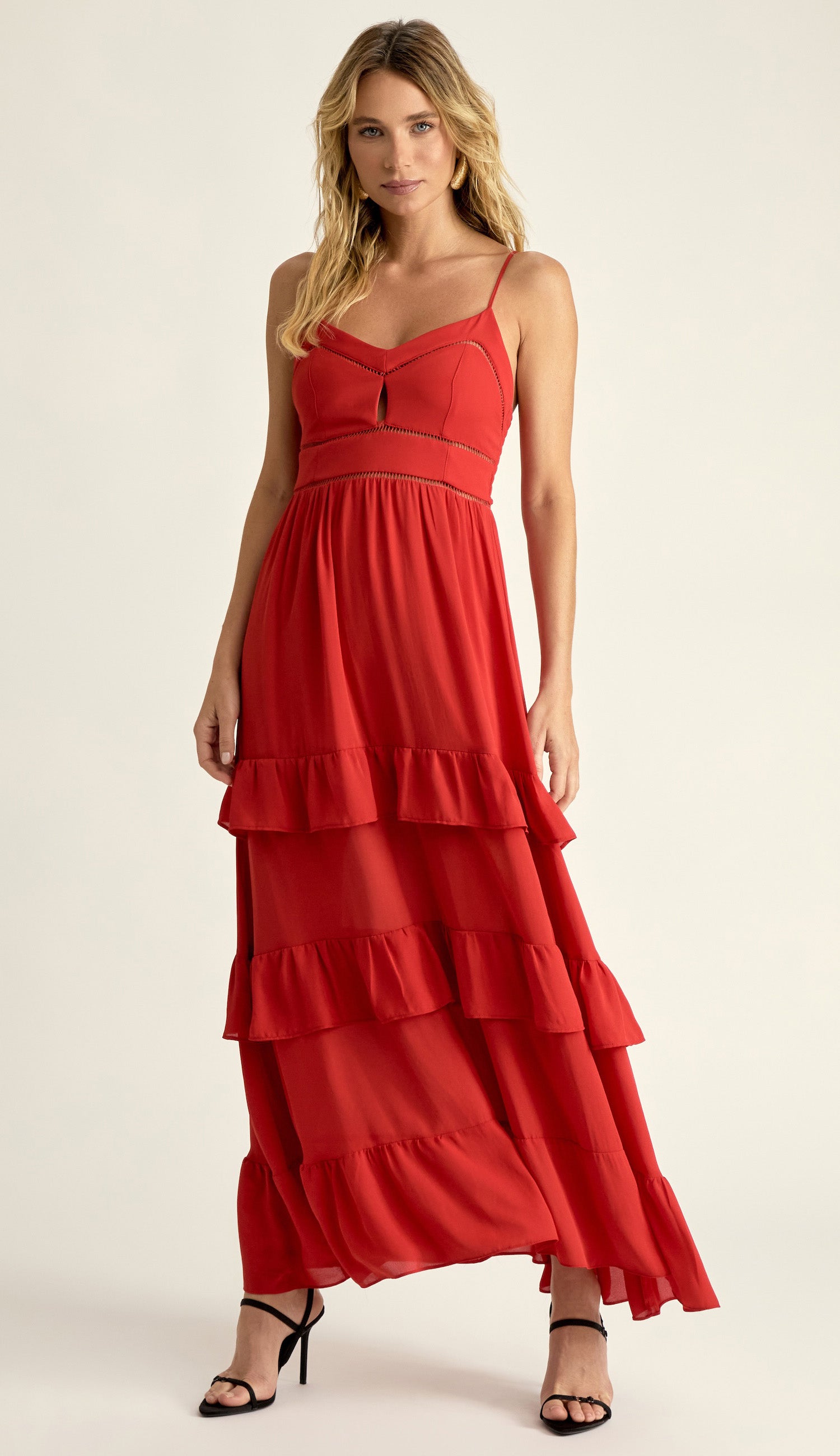 Vestido longo confeccionado em crepe leve com forro curto. Possui decote princesa, alcinhas reguláveis, recortes que modelam a peça, detalhes de entremeio vazado no busto e na cintura, saia em A com camadas de babados franzidinhos estilo três Marias, fenda frontal, lastex nas laterais das costas para maior conforto e fechamento traseiro por zíper invisível.