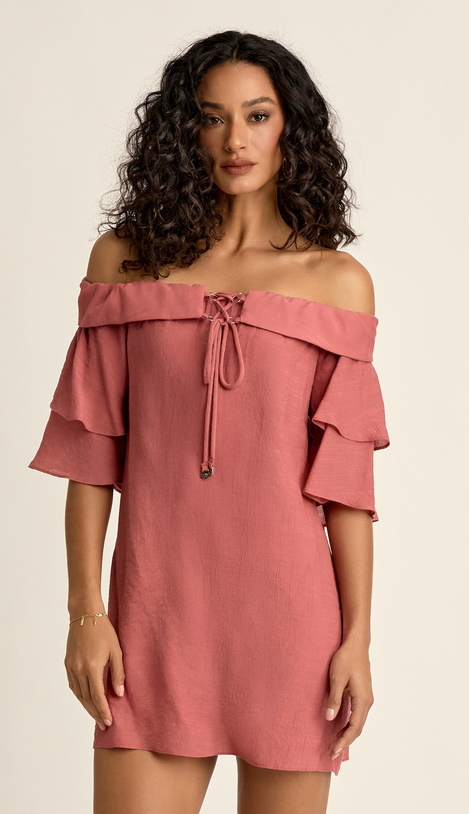 Vestido curto com forro, confeccionado em poliviscose texturizado com aspecto de linho e efeito amassadinho. Possui modelagem soltinha, decote ciganinha com elástico e pala dobrada sobreposta ao decote com lastex atrás e detalhe de argolinhas de metal com tirinha para transpasse e amarração na frente que tem ponteiras de metal em formato de conchinha; e conta ainda com mangas 3/4 sino com duas camadas de babados.