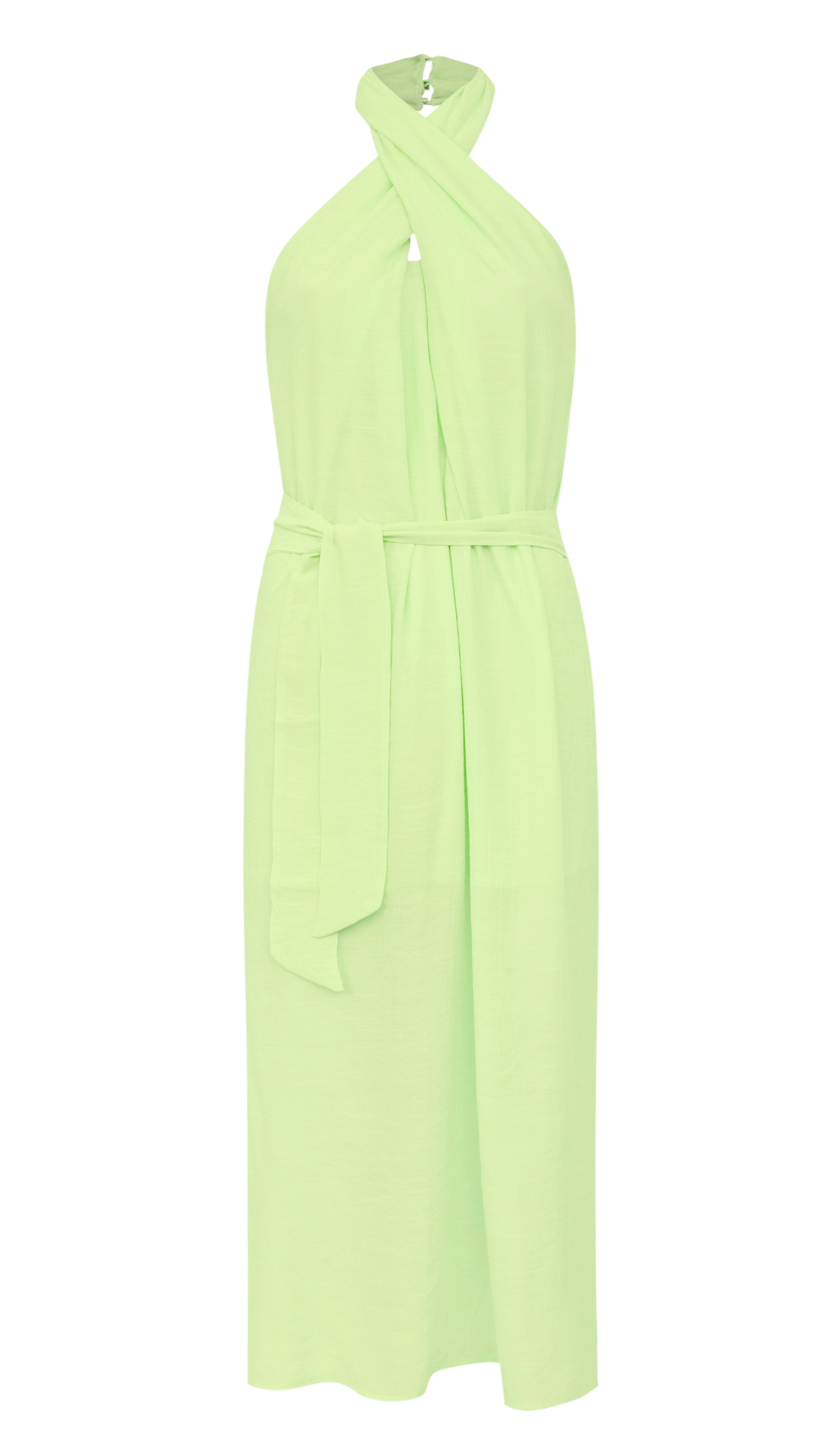 Vestido longo e amplo com forro, confeccionado em poliviscose texturizado com aspecto de linho e efeito amassadinho. Possui modelagem frente única com faixas pregueadas e transpassadas que vão até o pescoço com fechamento por botões esmaltados na nuca, costas nuas, lastex franzido nas costas da saia para melhor ajuste ao corpo, fendas laterais e acompanha faixa solta para amarrar.