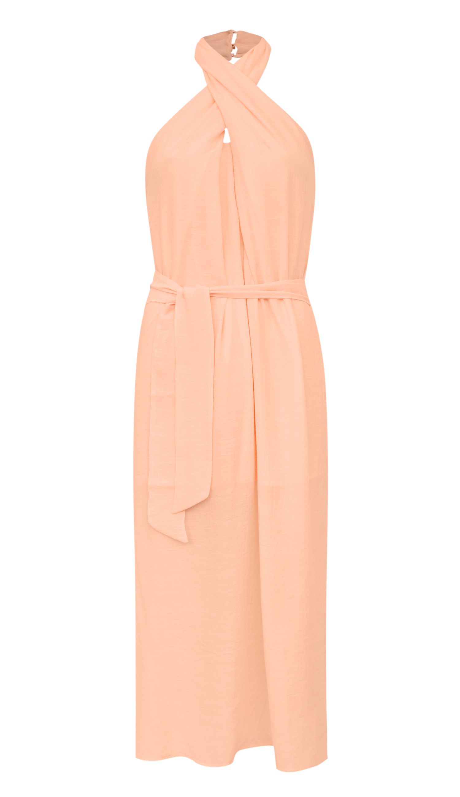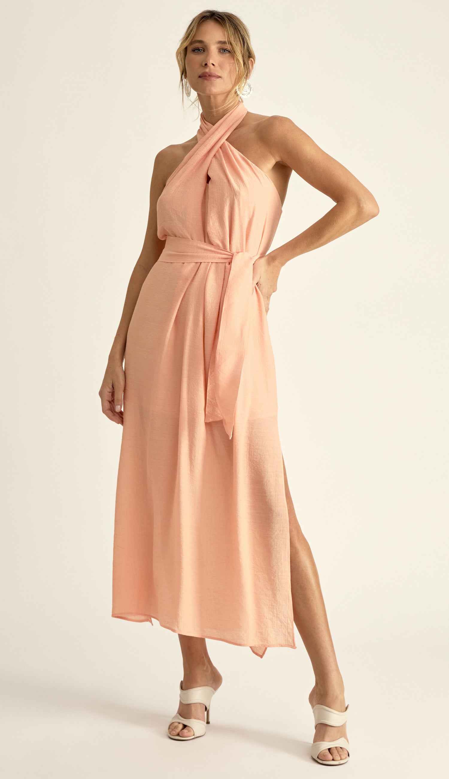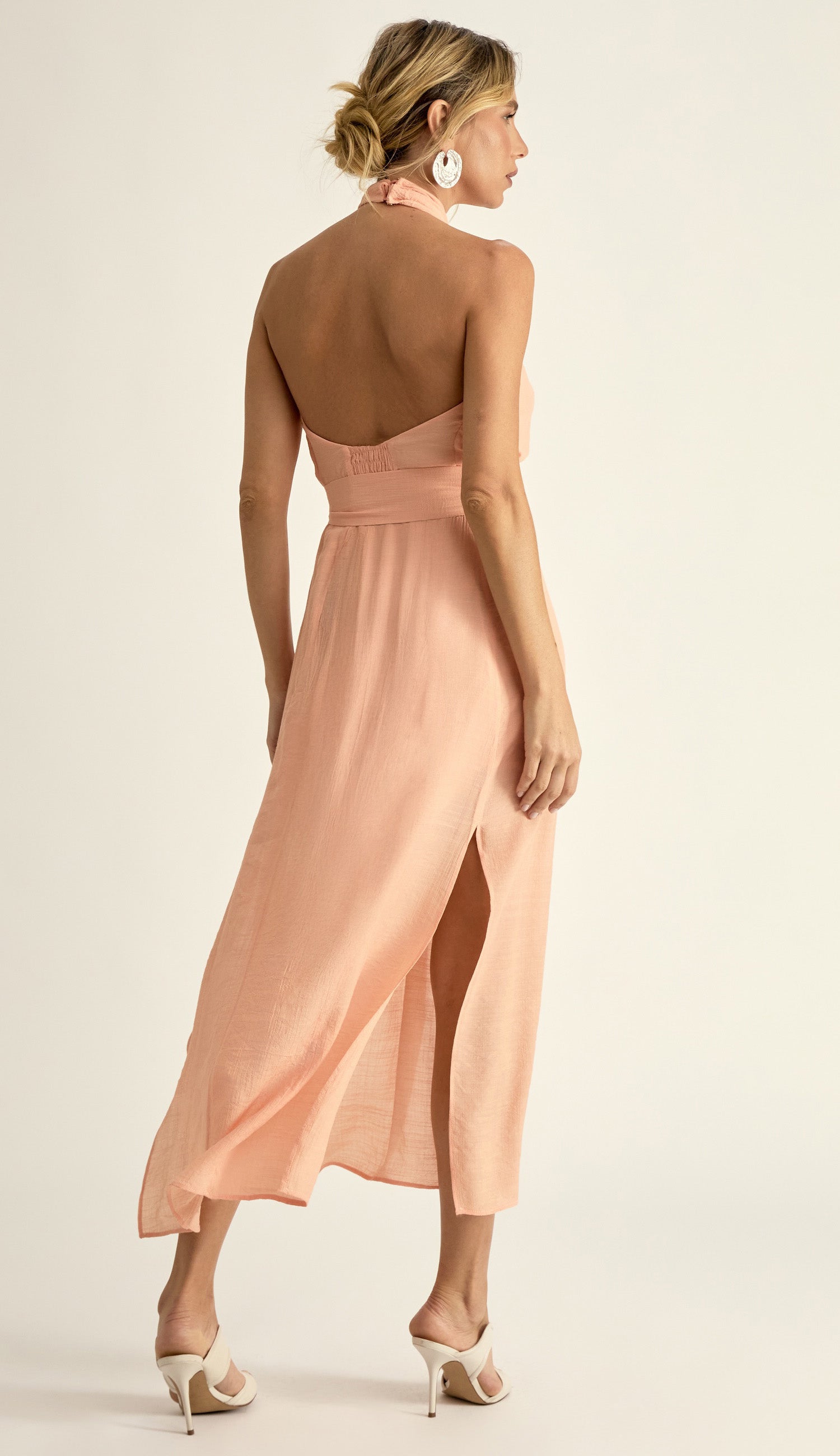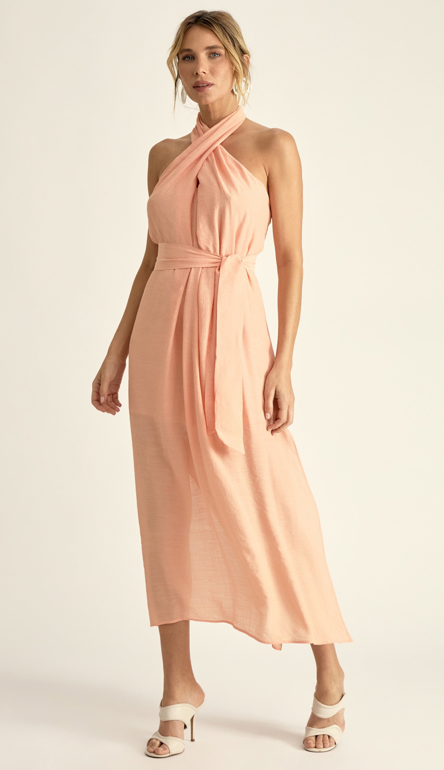 Vestido longo e amplo com forro, confeccionado em poliviscose texturizado com aspecto de linho e efeito amassadinho. Possui modelagem frente única com faixas pregueadas e transpassadas que vão até o pescoço com fechamento por botões esmaltados na nuca, costas nuas, lastex franzido nas costas da saia para melhor ajuste ao corpo, fendas laterais e acompanha faixa solta para amarrar.