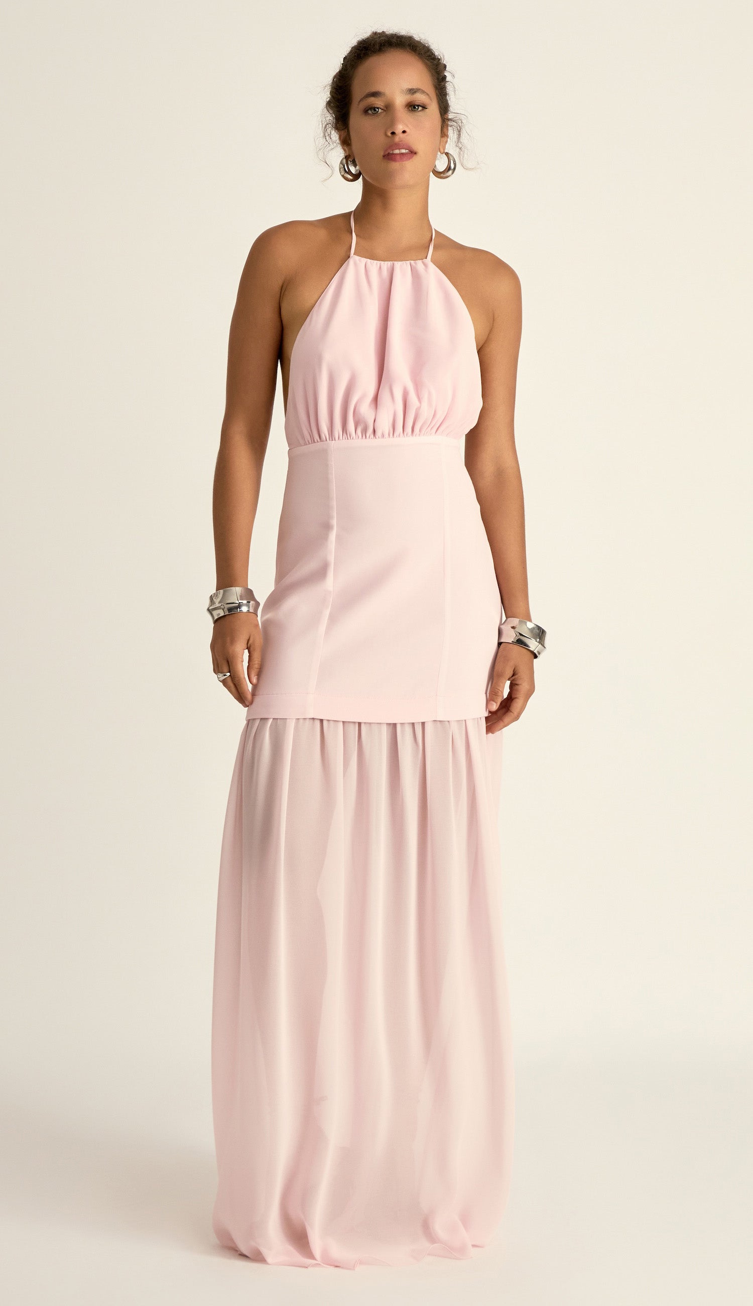 Vestido longo confeccionado em crepe leve com forro. Possui decote halter com franzidinho na gola, alcinhas compridas para amarrar na nuca com ponteiras de metal em formato de conchinha, franzidinho também na cintura deixando um aspecto blusê na parte do busto, saia com forro e justinha até a altura do quadril onde conta com recorte, pala e franzidinho com saia soltinha a partir daí e sem forro nessa região, deixando um aspecto de sutil transparência e bastante fluidez. Conta ainda com costas nuas e fechamento traseiro na saia por zíper de metal com a mesma ponteira de metal em formato de conchinha.