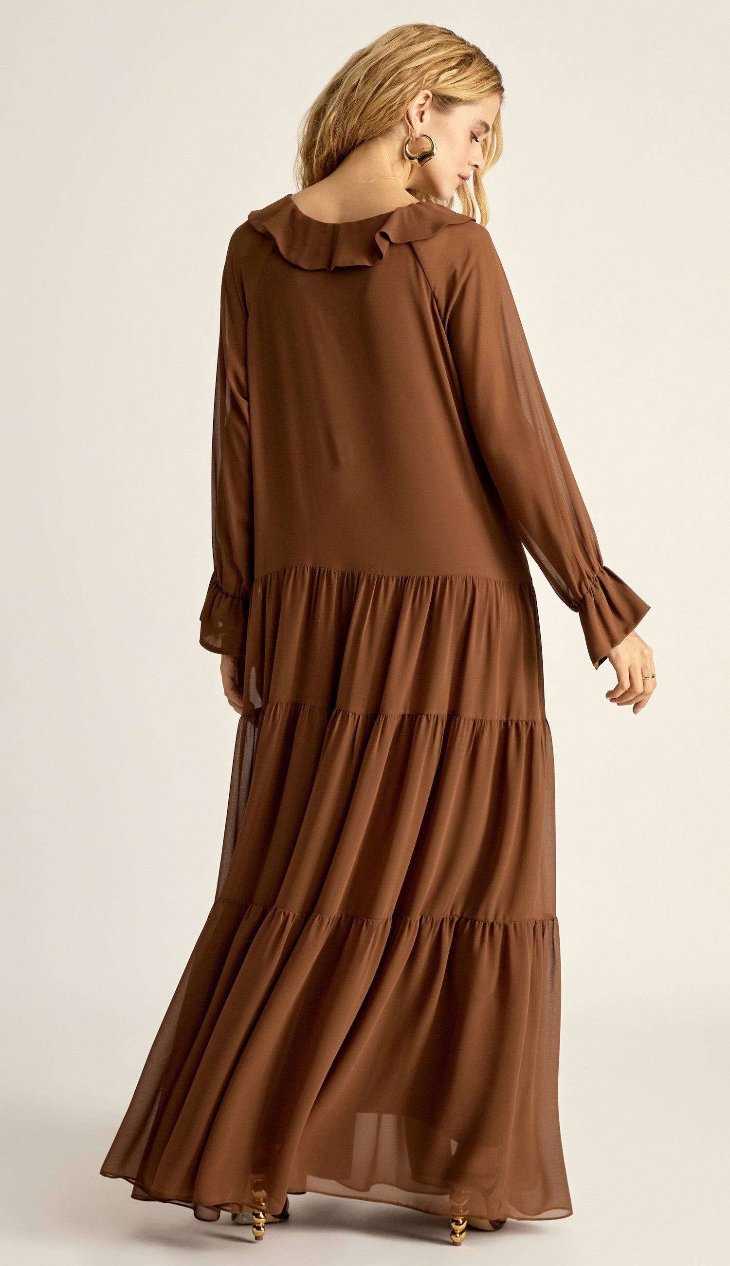Vestido longo amplo confeccionado em crepe leve com forro longo. Possui decote redondo com aberturinha em V central e tirinha fixa no decote com ponteiras de metal em formato de conchinha para amarração; pala em babadinho dobrada na gola, mangas longas com elástico no punho criando um babadinho também e conta ainda com recortes e franzidos em camadas na saia, estilo três marias.
