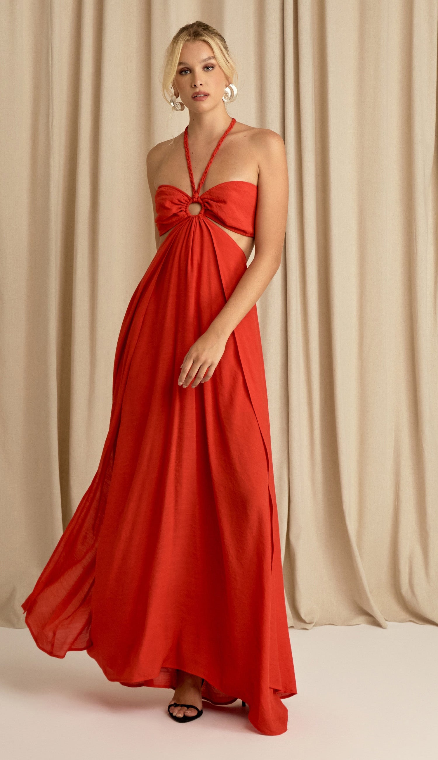 Vestido longo com forro; confeccionado em poliviscose texturizado com aspecto de linho e efeito amassadinho. A modelagem é frente única com a parte busto fixo à saia apenas na frente, deixando toda a região da cintura à mostra; fechamento do busto nas costas por tirinhas para ajuste e amarração; decote coração com argola no centro de onde saem tirinhas trançadas para amarrar no pescoço e elástico interno para melhor ajuste ao corpo. A saia possui tirinha embutida nas costas para ajuste e amarração e sobreposição de tecido em camada na frente, que dá um lindo movimento à peça.