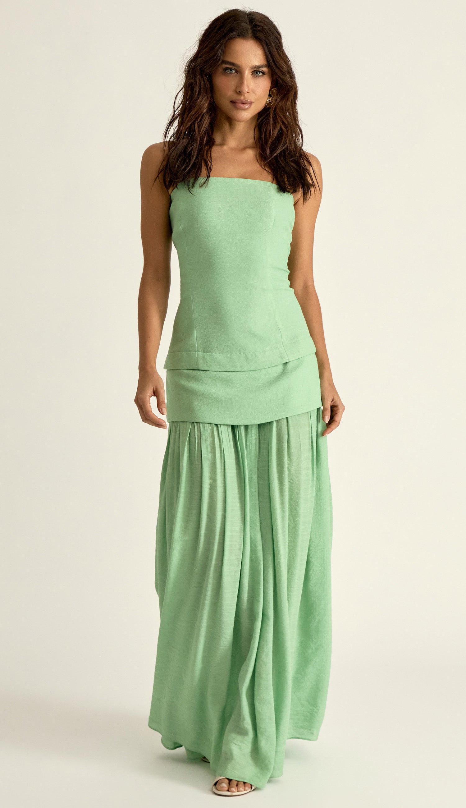 Vestido longo sem mangas e com forro; confeccionado em poliviscose texturizada com aspecto de linho e efeito amassadinho. Possui decote reto com silicone elástico interno para maior segurança, recortes no corpo da peça que modelam a silhueta, sendo bem justinho até a altura do quadril onde conta com recorte e duas palas sobrepostas sendo a última mais larga. Logo abaixo, tem uma saia franzidinha bem soltinha e fluida que dá um frescor ao look e nas costas, possui o fechamento por zíper invisível.