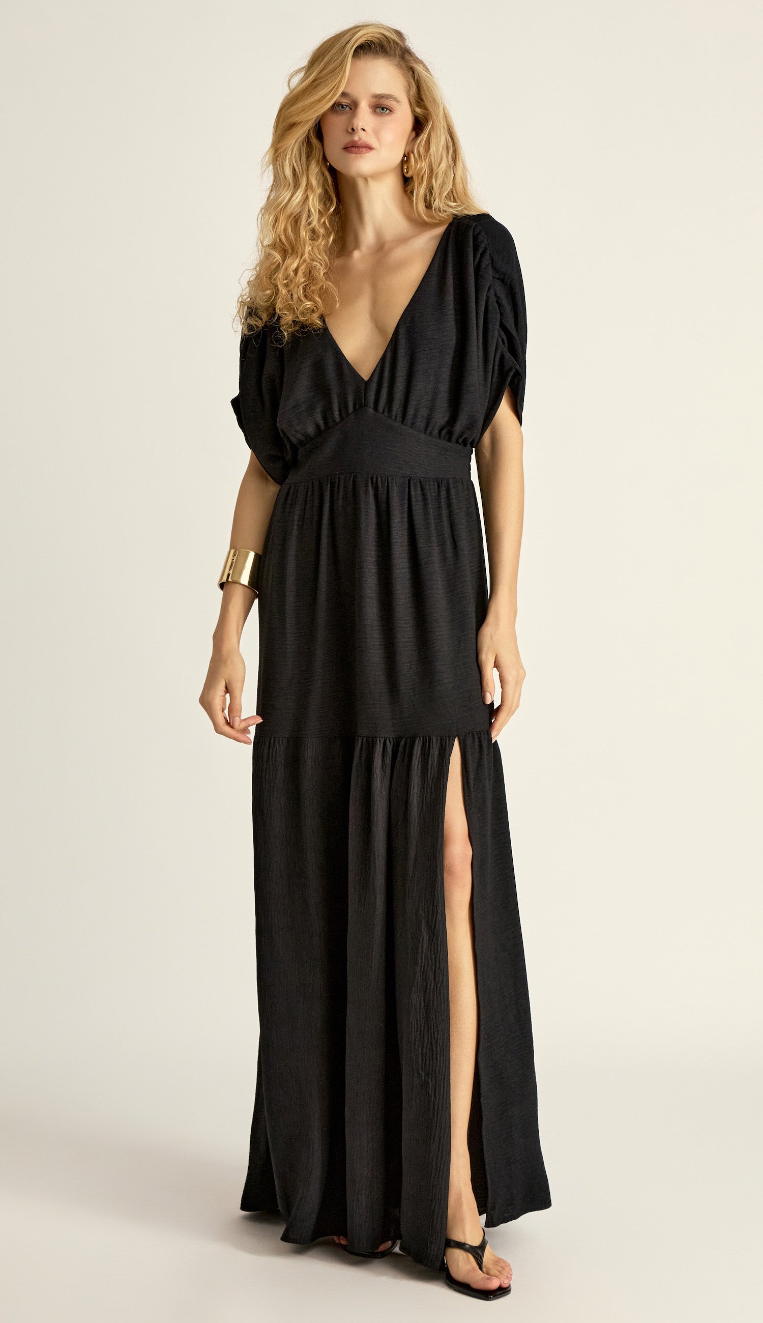 Vestido longo com forro na saia, confeccionado em crepe texturizado com efeito amassadinho. Possui decote em V com tecido duplo no busto para não ficar transparente, pala com franzidos na cintura, mangas morcego curtas com detalhe franzido nos ombros, saia com recorte franzido de onde sai uma fenda lateral super charmosa, fechamento traseiro por botão esmaltado na nuca, abertura logo abaixo e lastex franzido na cintura costas, para garantir maior conforto.