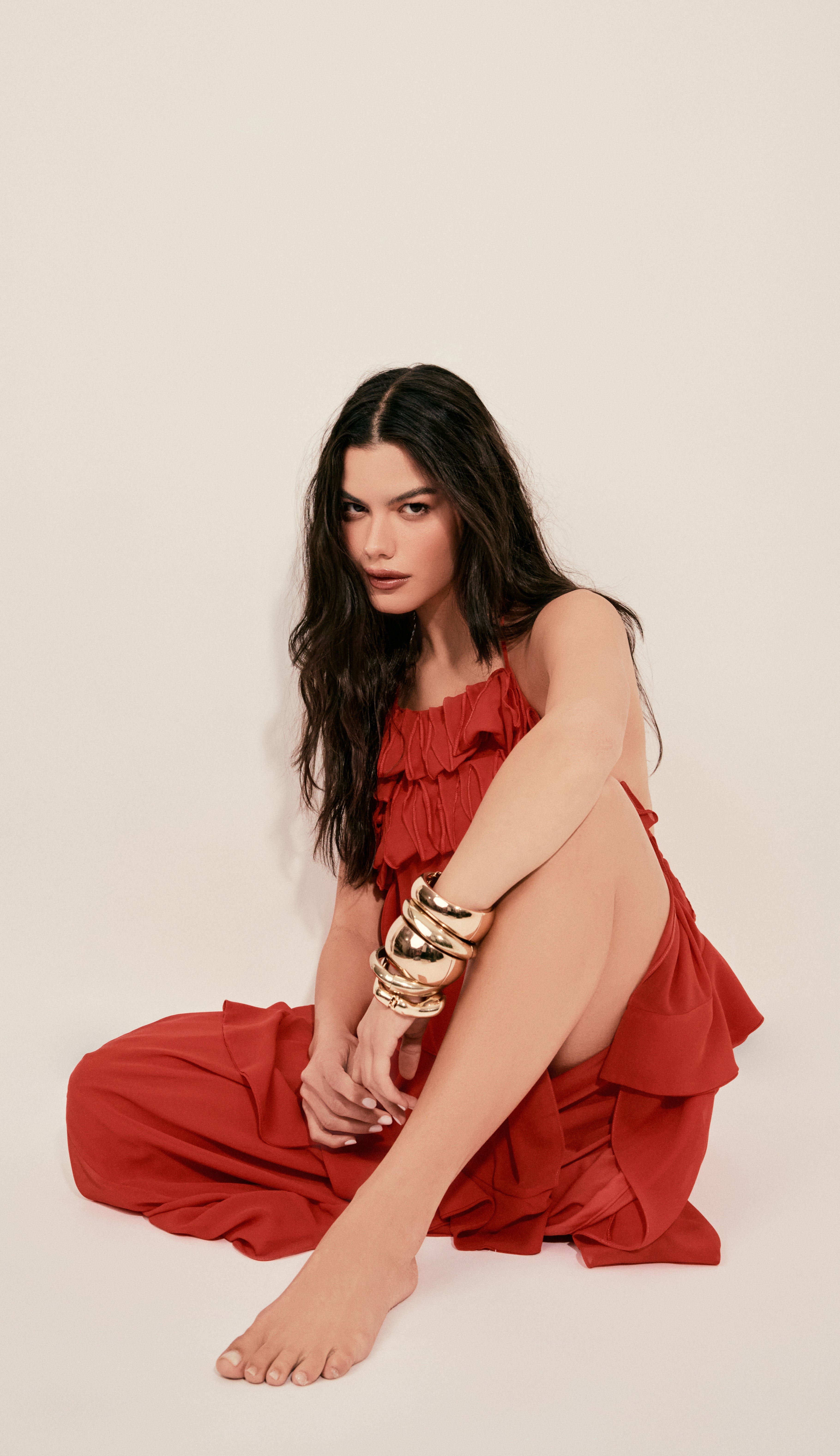 Vestido longo confeccionado em crepe com forro. Possui modelagem frente única, decote halter com babadinhos que vão até as costas, alcinhas para amarração no pescoço, babadinhos verticais também na parte da frente do comprimento da peça, saia bem solta e fluida e costas nuas com tirinha embutida para ajuste do decote e amarração.