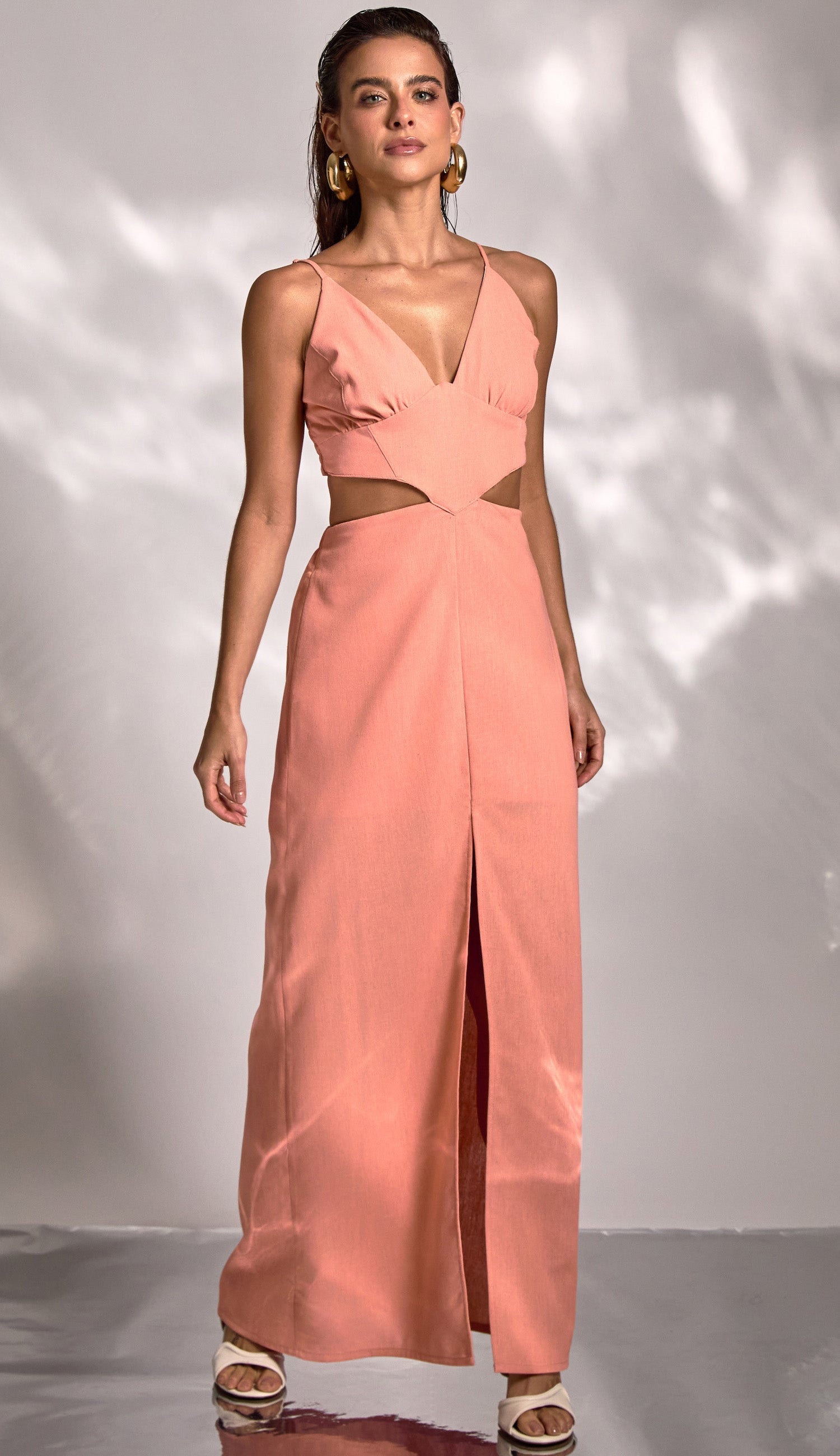 Vestido longo confeccionado em linho com forro. Possui decote em V com recortes e franzidinhos que modelam o busto; pala logo abaixo com ponta no centro; busto fixo à saia apenas por recorte frontal, deixando toda a região da cintura à mostra; alcinhas reguláveis; lastex nas costas do top; elástico franzido nas costas da saia; fenda frontal na saia e fechamento traseiro tanto do top quanto da saia por zíper de metal, sendo o primeiro destacável e ambos com pingente que tem a conchinha da Laguna gravada.